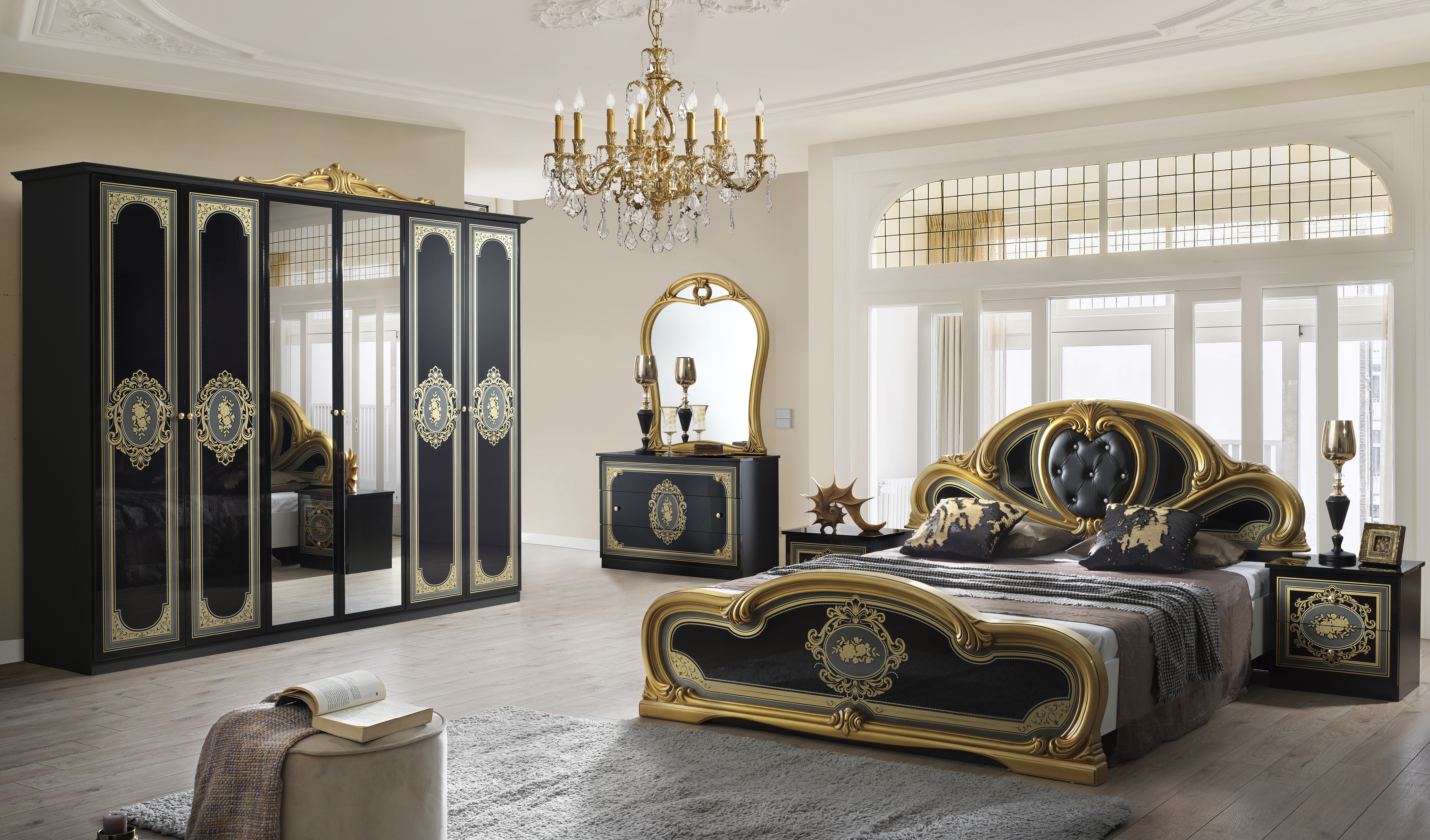 Dormitor Clarissa, negru/auriu, pat 160x200 cm, dulap cu 6 usi, comoda, 2 noptiere