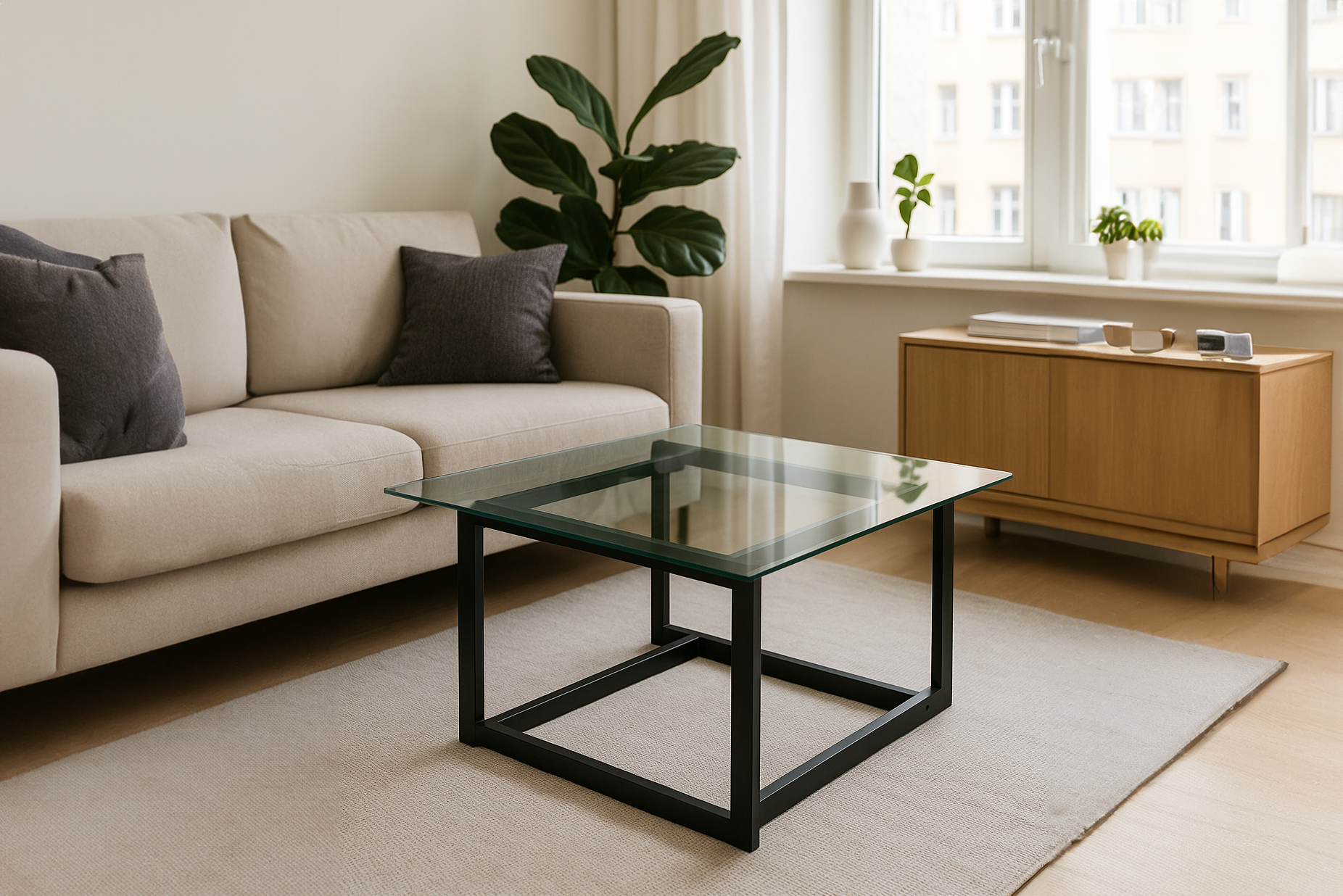 Masa are o structură robustă din metal și o formă pătrată, fiind acoperită cu un blat din sticlă securizată, ce oferă un plus de durabilitate și stil. Sticla tratată termic oferă o rezistență deosebită deoarece are un strat exterior incredibil de durabil, care poate rezista cu ușurință la impact și schimbări de temperatură, fiind de până la 10 ori mai rezistentă la spargere comparativ cu sticla normală.